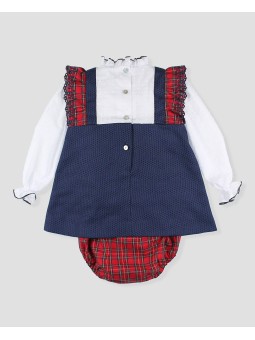 Este encantador jesusito efecto pichi combina el cuerpo de algodón azulón en tejido ojo de perdiz con una delicada tira bordada en tartán que adorna el delantero. El efecto blusa en plumeti blanco con lacito en cuello y mangas fruncidas aporta dulzura y sofisticación al conjunto. Incluye braguita de cuadro escocés a juego. Un diseño pensado para brillar en celebraciones navideñas y momentos especiales. Hecho en España