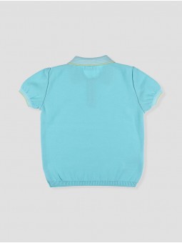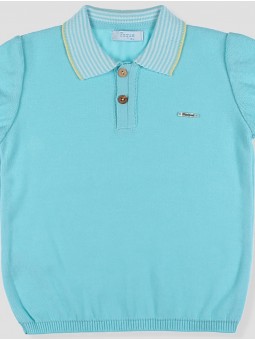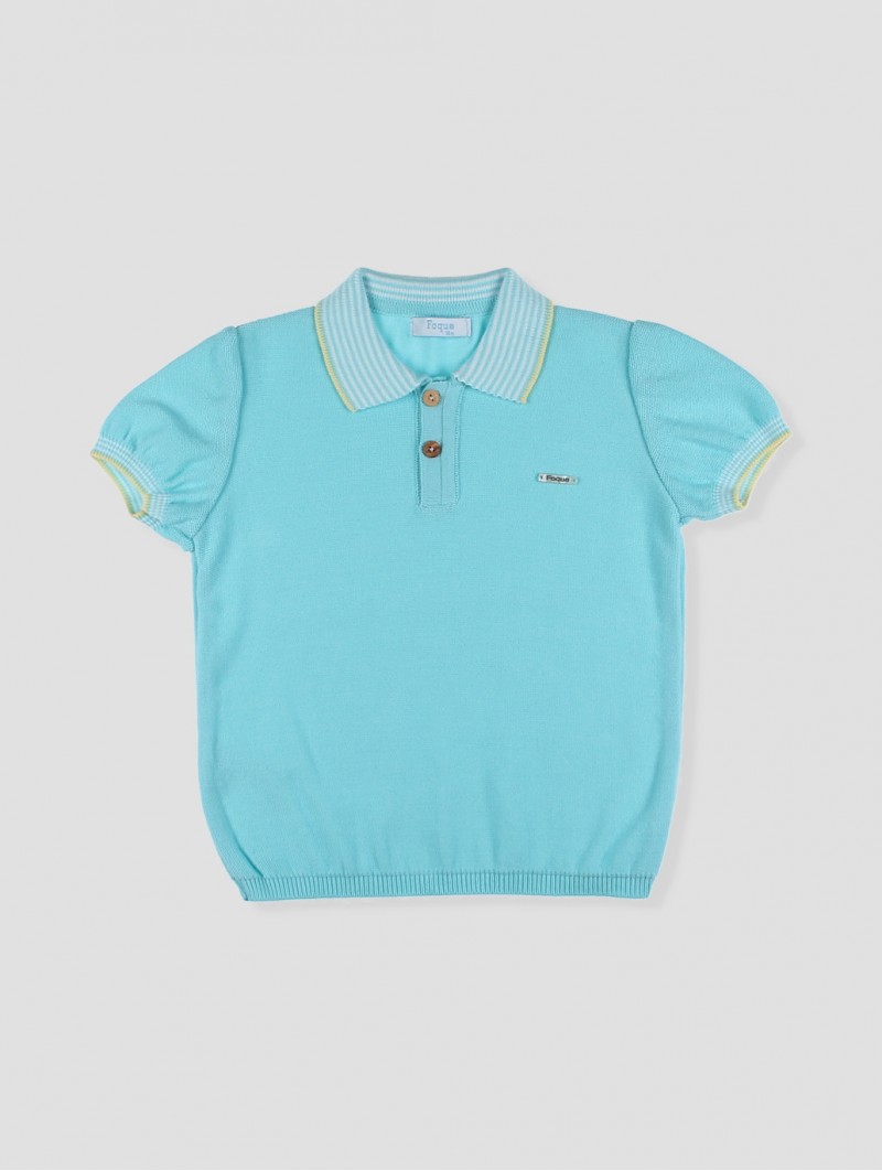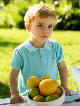 Pólo de ponto para criança em hilatura 100% algodão turquesa, detalhes listados em pescoço e mangas com vivos amarelos, cintura reamatada em canalé. Uma prenda muito em tendência para este verão, a combina com o peto ou calça curta de loneta, perfeito para o seu dia a dia. Tallaje até a 6 anos. Coleção Saint Tropez. Facto na Espanha