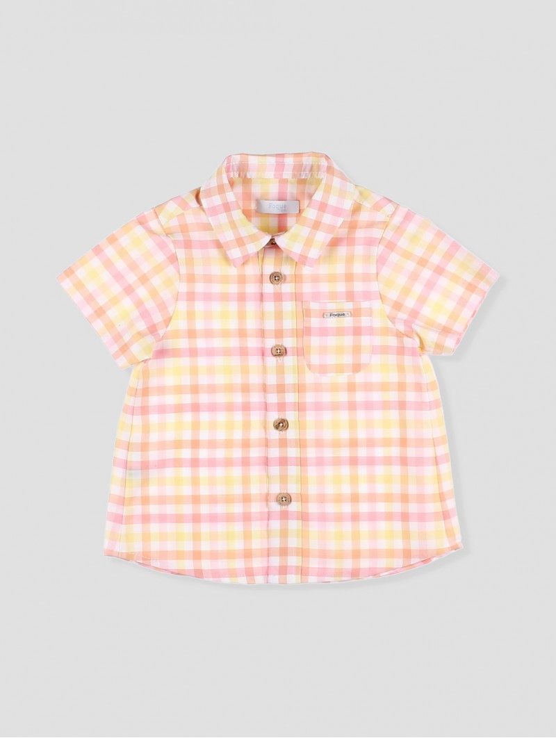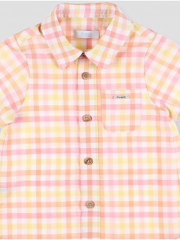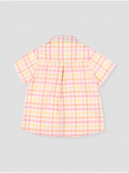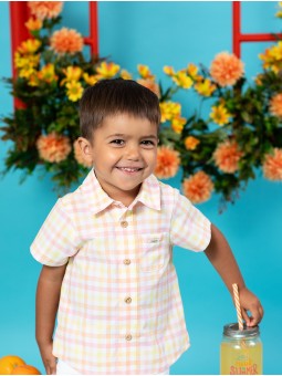 Camisa de quadros em tons bolo da Coleção Holanda, desenhada para um look fresco e atual. Confecionada em tecido ligeiro e transpirável, conta com pescoço clássico, fechamento de botões de madeira e um bolso decorativo no peito. O seu estampado suave converte-a em uma prenda versátil, ideal para ocasiões especiais e passeios diários nos dias ensolarados. Um imprescindível no armário infantil pelo seu conforto e estilo. Combina-o com o short básico alvo! Facto na Espanha.