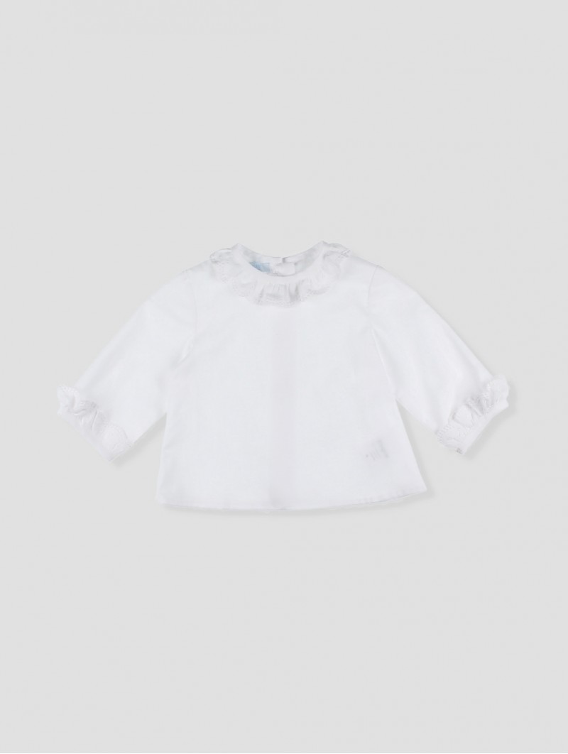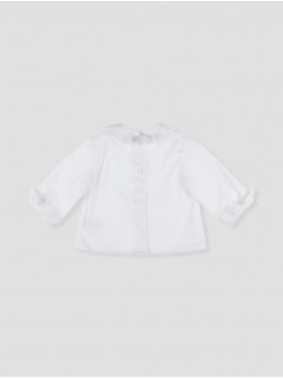 Blusa para bebé com delicado pescoço volante e detalhe de encaixe. Confecionada em tecido suave e transpirável, é ideal para manter ao teu bebé cómodo durante todo o dia. Os volantes nas mangas contribuem um toque elegante e clássico. Fechamento trasero com botões para maior facilidade ao vestir. Perfeita para ocasiões especiais ou dias ensolarados, combinando estilo e frescura. Facto na Espanha.
