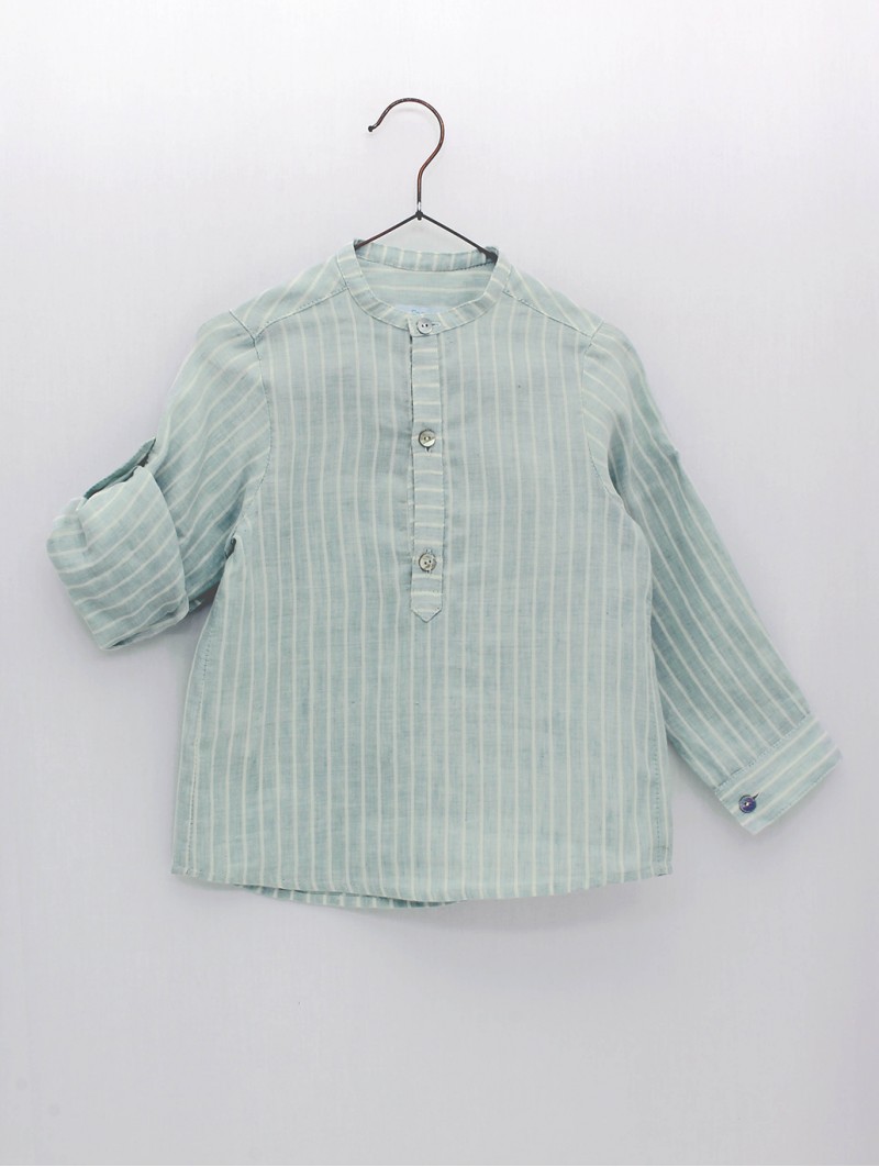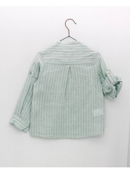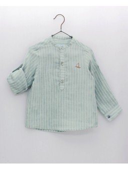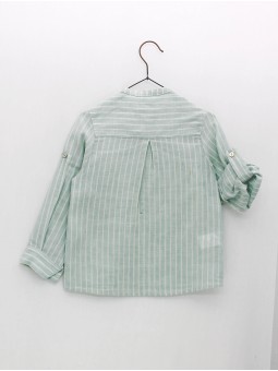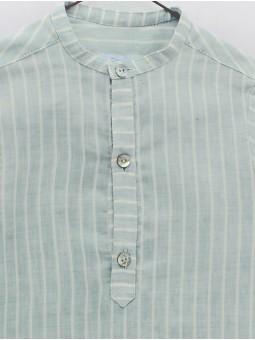 Camisa criança de manga longa confecionada em tecido 100% algodão com pescoço mao, em cor verde glaciar com listras em cor cru. Leva botões à altura do cotovelo para poder remangar. Combina com a calça curto da mesma Coleção Sofía referência 2416902. Clássico, elegante e com as cores da temporada!. Facto na Espanha
