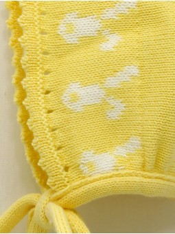 Capota de ponto liso para bebé criança-criança em cor amarelo, anuda com atira de ponto. o detalhe da greca de conejitos fá-la perfeita para combinar com os conjuntos e vestidos da coleção Yellow Flower. Feita na Espanha.