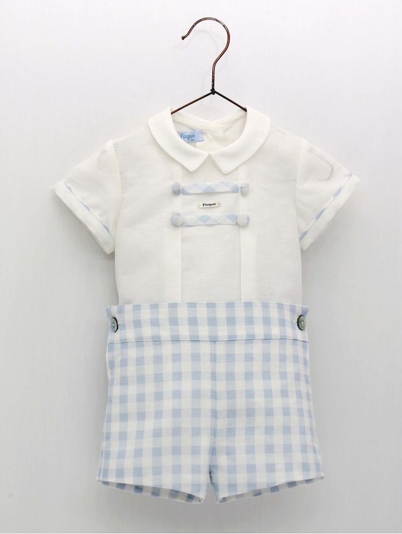 Conjunto de blusa de manga curta, pescoço camisero e dupla peça em quadro vichy no atacante com enfeito de botões, pantalón curto quadro vichy a jogo com a camisa. Coleção Doce. Desenhado e fabricado em Espanha.