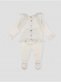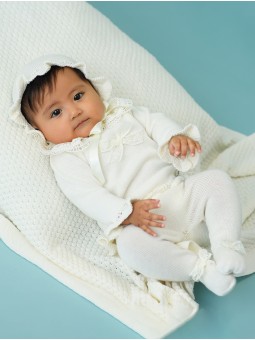 Conjunto de primeira posta para bebé criança, jubón beig de ponto com volantes pescoço guipur, botonadura nas costas e calça curta de ponto com pé detalhe laço tul. Tallaje de 0 a 18 meses. Coleção Roma. Cómodísimo para os primeiros dias e para ocasiões especiais. Facto na Espanha