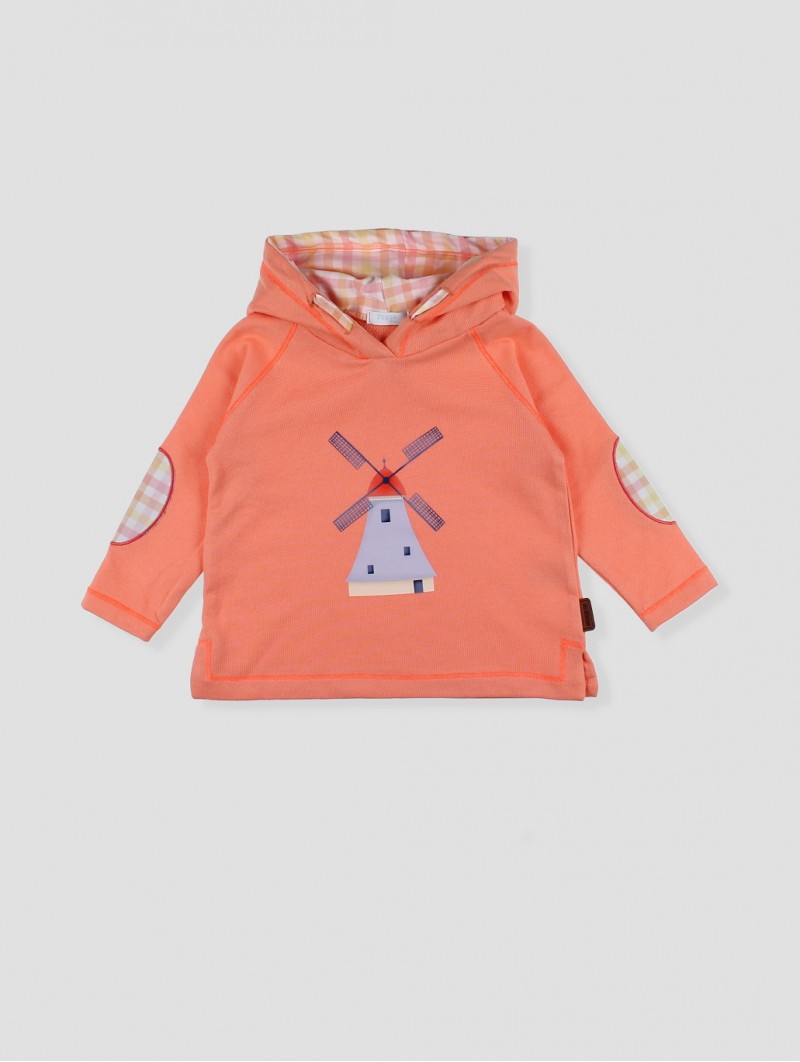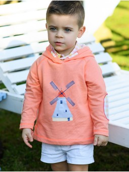 Sudadera com capucha da Coleção Holanda em cor coral, confecionada em tecido de felpa encaracolada, suave e transpirável. Destaca pelo seu estampado de molino vento no centro, coderas de quadros em tons bolo e capucha com interior forrado para maior conforto. O seu desenho moderno e divertido converte-a em uma opção perfeita para passeios e atividades ao ar livre em dias frescos. Uma prenda prática e cheia de estilo, tanto para criança como para criança. Feita na Espanha.