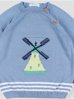 Camisola para criança/criança em ponto lisa cor azulina de pescoço redondo com abertura lateral com dois botões de madeira, comeces de canalé e listagens em cor branco a contraste, exclusivo desenho Foque de um molino de vento em tom lima no atacante. Combina com a calça curto quadro vichy e o pólo piquei da mesma coleção Provenza. Guapo, cómodo e com estilo. Facto na Espanha.