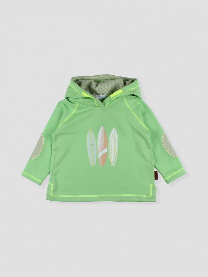 Sudadera unisex em vibrante cor verde, desenhada para os pequenos aventureiros. Destaca o seu original estampado frontal de tabelas de surf, que contribui um toque moderno e divertido. Os detalhes de cotovelos reforçados e as costuras em contraste acrescentam resistência e estilo. A capucha forrada assegura maior conforto em dias frescos e o seu tecido suave de algodão proporciona calidez sem sobrecalentar. Ideal para combinar. Uma prenda funcional e versátil para qualquer ocasião. Facto na Espanha