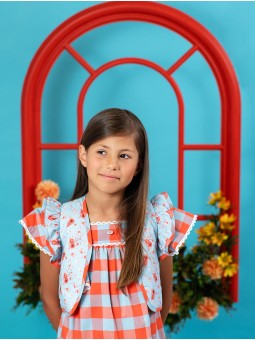 Este delicado chaleco curto para criança destaca pela sua alegre estampado floral sobre fundo azul, ideal para contribuir frescura a qualquer conjunto. Os volantes nos ombros, arrematados com ribetes em contraste, contribuem um ar romântico e distintivo. O seu corte aberto e ligeiro converte-o em prenda-a perfeita para combinar com vestidos ou blusas, contribuindo um toque especial a conjuntos primaverales ou veraniegos. Facto na Espanha