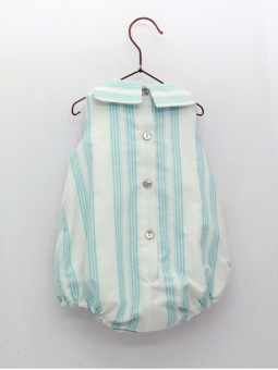Pelele bebé menino sem mangas, confeccionado em tecido de listras verde água, pechera com dois botões no atacante, chapa corporativa Foque nacarada, botonadura no baixo e borracha elástica. Facto em Espanha