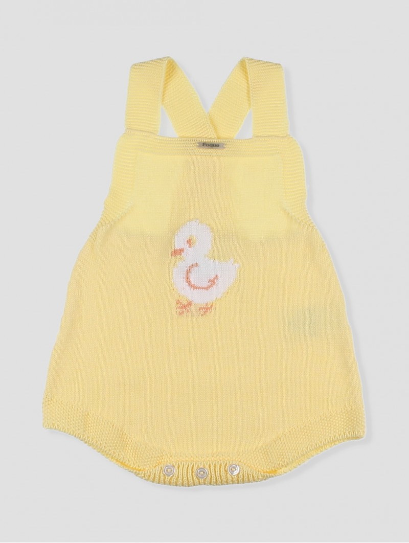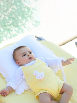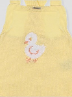 Ranita de ponto para bebé criança/criança confecionada com hilatura 100% algodão amarelo com intarsia de um simpático pollito no atacante, chapa corporativa Foque. Leva botões na pernera para facilitar a mudança de fralda. Ideal para pôr só, os dias mais calurosos ou também a podes combinar com a blusita de batista branca referência 2515556. Coleção Campiña Inglesa