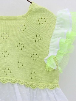 Top criança com canesú de ponto calado em cor lima com volantitos combinado com tecido plimeti alvo no baixo. Combina-o com o short de listras da mesma Coleção Lorenzo. Facto na Espanha