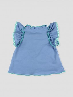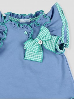 Este top sem mangas para criança é uma prenda imprescindível para os dias mais cálidos. Confecionado em um suave tecido de ponto azul, destaca pelos seus volantes decorativos e ribetes em vichy verde que contribuem um ar alegre e veraniego. O grande laço lateral com chapa corporativa Foque, dá-lhe um toque distintivo e especial. O seu desenho cómodo e ligeiro converte-o na eleição perfeita para combinar com shortsde nossas coleções, em looks frescos e desenfadados. Facto na Espanha.