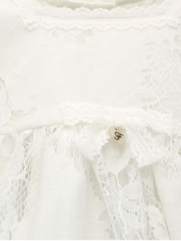 Jesusito para bebé menina com pescoço caixa e manga curta, tecido calado de flores e detalhe laço no atacante. Combina com a jaqueta 2315803 da mesma Coleção Batizo. Um look perfeito para uma grande ocasião.