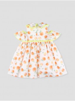 Vestido de criança com estampado de melocotones, confecionado em tecido ligeiro e transpirável. Com elegantes volantes nos ombros e ribete neón, contribui frescura e estilo, ideal para os dias ensolarados. O seu corte amplo oferece conforto e liberdade de movimento, perfeito para passeios, celebrações e dias de verão. Fechamento com cremalheira nas costas para maior practicidad. Coleção Havana. Facto na Espanha.