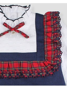 Este encantador jesusito efeito pichi combina o corpo de algodão azulón em tecido olho de perdiz com uma delicada atira bordada em tartán que enfeita o atacante. O efeito blusa em plumeti branco com lacito em pescoço e mangas franzidas contribui doçura e sofisticação ao conjunto. Inclui cuequinha de quadro escocês a jogo. Um desenho pensado para brilhar em celebrações navideñas e momentos especiais. Facto na Espanha