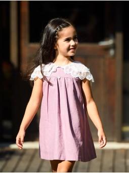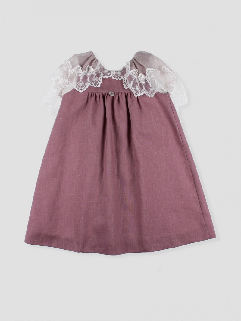 Este vestido para criança é a combinação perfeita entre doçura e sofisticação. O tecido de linho tom malva contribui um ar elegante, enquanto o volante de gasa e entredós tipo capa, realça o seu desenho com um toque delicado. O corte império permite liberdade de movimento, ideal para eventos e celebrações especiais. O seu fechamento trasero com botão facilita o ajuste, garantindo conforto e estilo. Uma prenda única que não pode faltar no armário das mais pequenas. Facto na Espanha.
