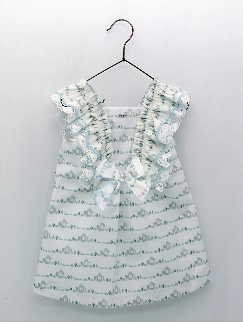 Vestido bebé criança estampado casitas com volantes nos ombros enfatizados com rulillo e puntilla branca, enfeito laço em centro atacante. Abrocha na espaldda com botões de nácar natural. CC. Casitas. Encanta-nos este estampado!