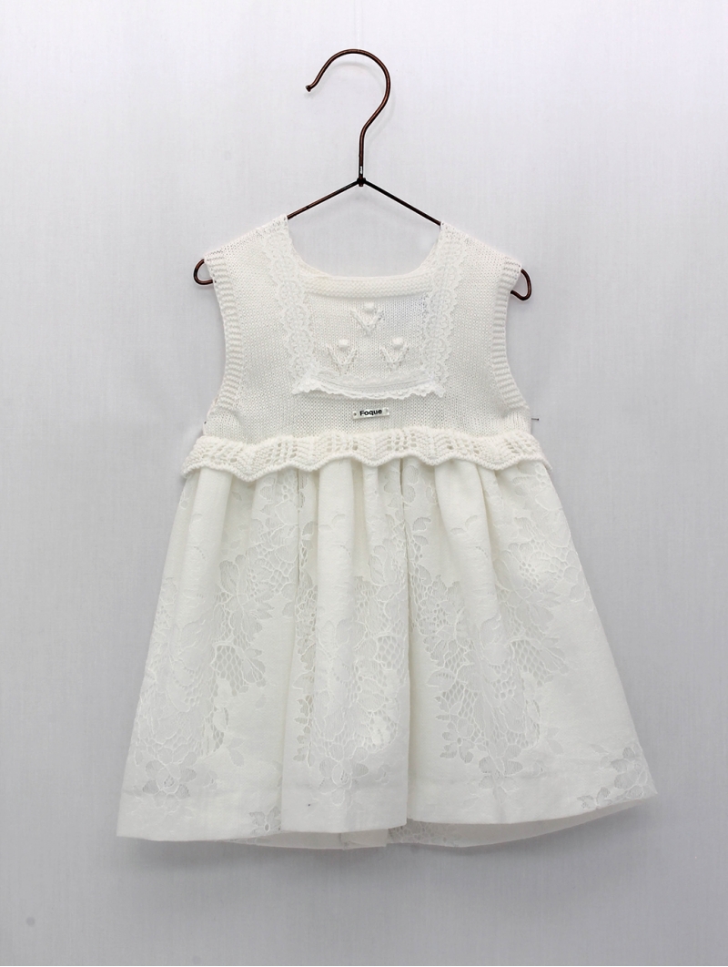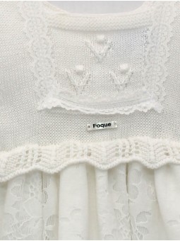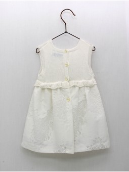 Vestido bebé menina tipo faldón com o corpo de ponto liso, sem mangas, com comece em ondas, detalhe flores no atacante; saia em tecido calado de flores cor crua. Disponível da talha 0 a 36 meses. Combinalo com a capota da teia 2315803 e os patucos tipo mercedita ref. 2311812. Coleção Batizo