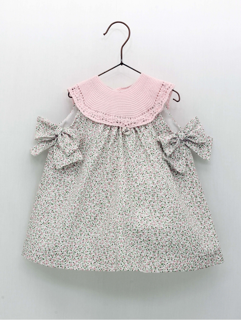 Vestido bebé menina confeccionado em tecido liberty 100% algodão, pescoço de ponto de ponto tipo capacete, sem mangas e lazadas aos lados, detalhe chapa corporativa redonda Foque no atacante. Coleção Caballito de Mar. Uma prenda única para o teu bebé.